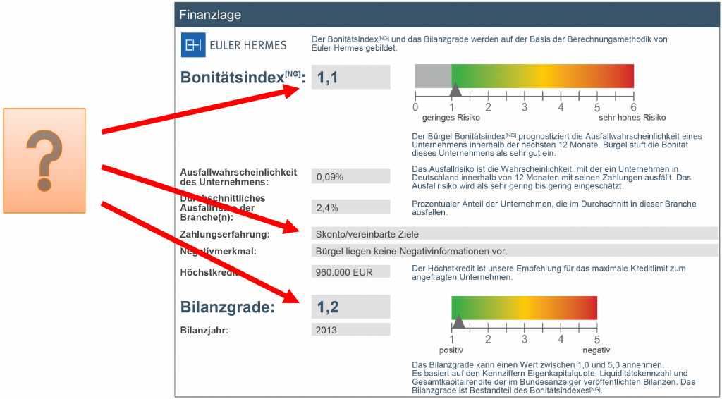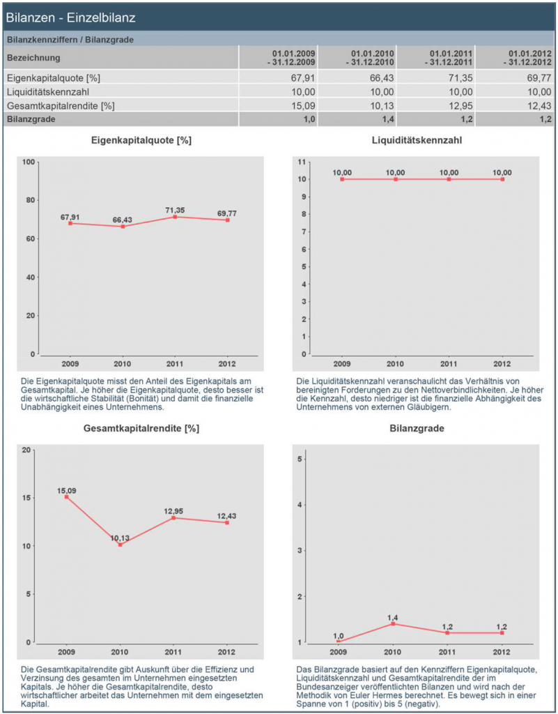 Berechnung der Eigenkapitalquote Gesamtkapitalrendite und Liquiditätskennzahl. Diese Kennzahlen werden im Bilanzgrade verdichtet, welches exklusiver Bestandteil der Bonitätsauskunft ist.